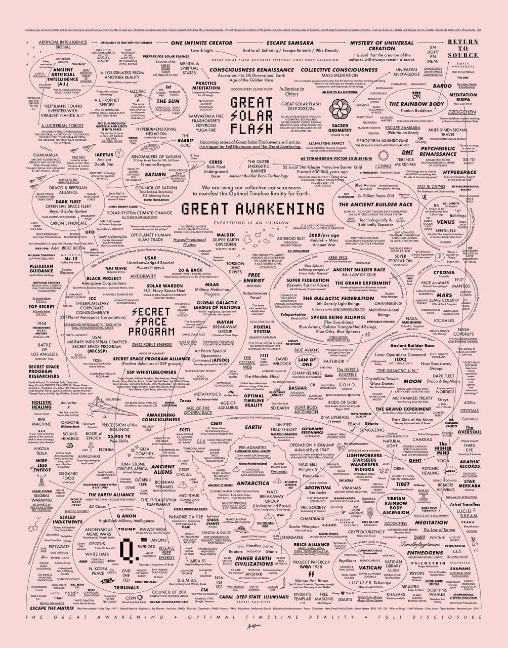 The Great Awakening – Un processo sociale attraverso cui le persone espongono la presunta natura malvagia del Deep State. Il processo sarebbe iniziato nel 2017 con il primo “drop” di Q.