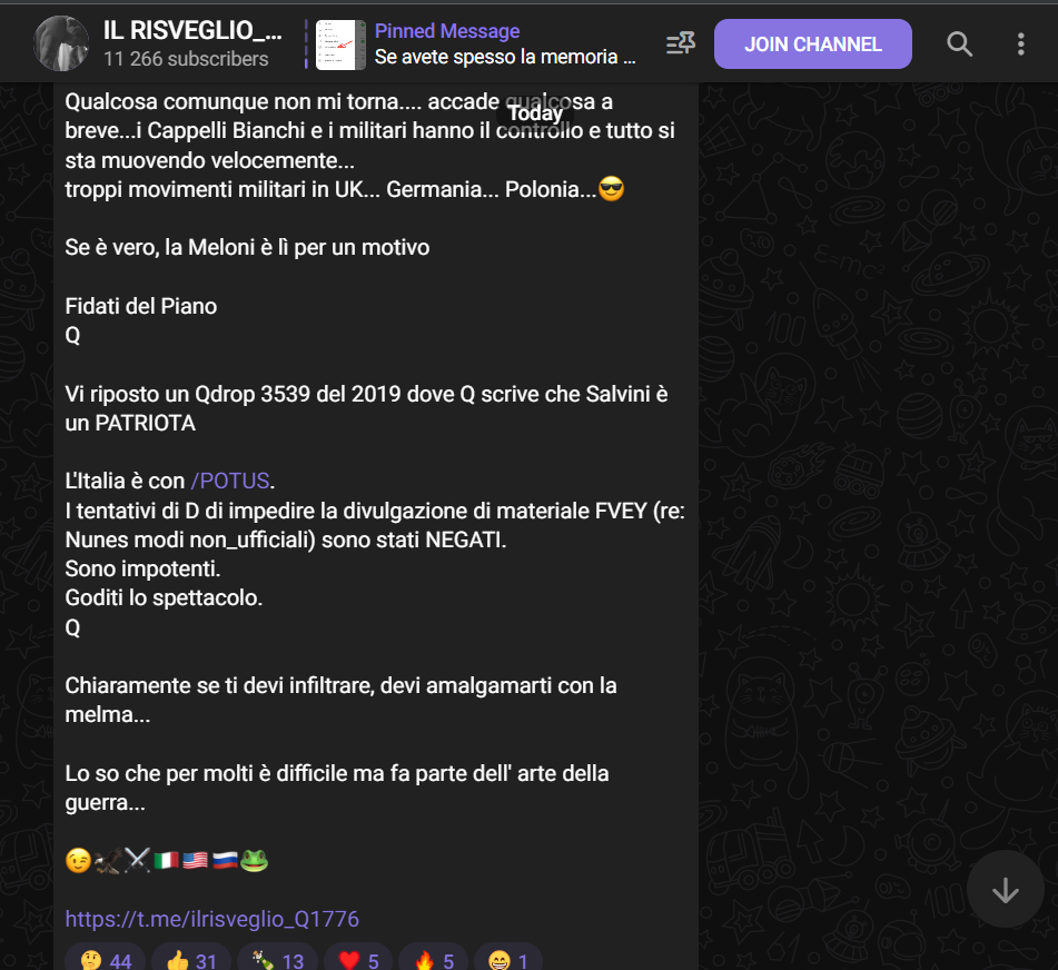 Dopo che i risultati delle elezioni hanno annunciato Fratelli d’Italia come primo partito, nel gruppo Il Risveglio di Q_1776 è comparsa l’immagine della leader Giorgia Meloni con scritto: «Non ho mai sentito nessun politico spiegare così perfettamente contro cosa ci troviamo di fronte e perché combattiamo. Quando guardi questo video, ti renderai presto conto del motivo per cui l’establishment ha paura di lei».
