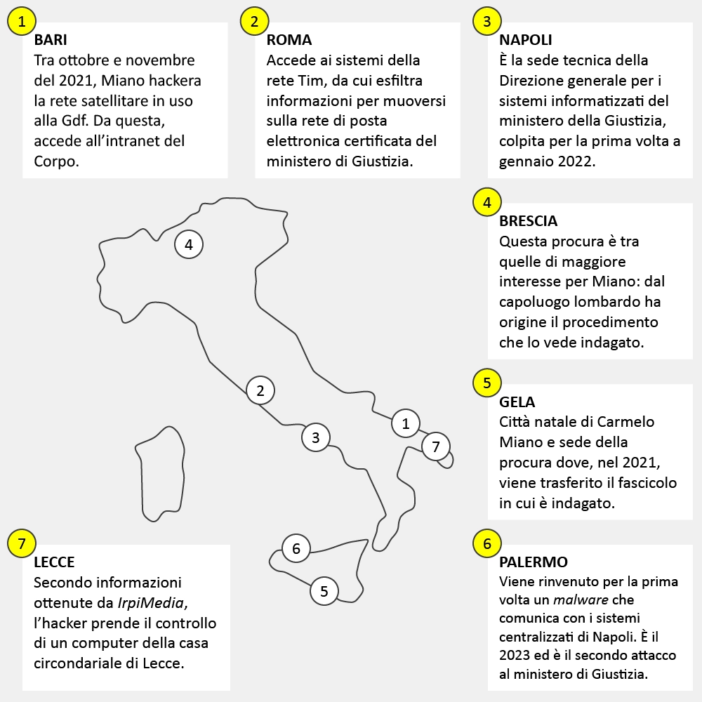 Grazie a quest’ultima, Miano ricerca e acquisisce 19 caselle di posta elettronica appartenenti a personale della magistratura delle procure di Brescia e di Gela oltre che del personale tecnico che gestisce da Napoli l’infrastruttura della giustizia nazionale.