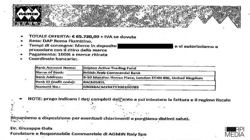 Per le commesse della Agmin non risultano pagamenti effettuati dalla protezione civile alla data del 10 aprile scorso. Interpellato da La Stampa, Giuseppe Gola, direttore commerciale di Agmin, sostiene che l’indicazione di Scipion Active Trading Fund sul contratto deve essere stato un errore. «Questo è un fondo che finanzia i nostri contratti con le Nazioni Unite», dice Gola. «In questo caso – conclude Gola -, una volta completate le forniture, il conto di pagamento sarà quello dell’Agmin Italy». Curioso visto che la firma in calce al contratto visionato da IrpiMedia e La Stampa è proprio quella dell’ingegner Gola.