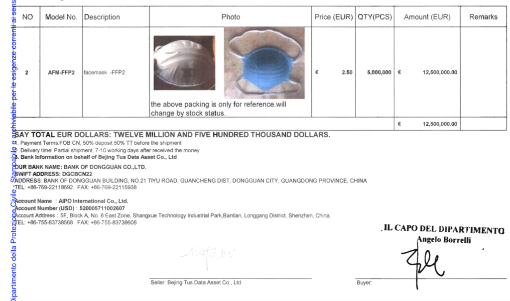 Al centro dell’acquisto bloccato c’è la Tus Data Asset: società statale fondata nel 2018 dall’università Tsinghua di Pechino che si occupa di big data, tecnologia blockchain e intelligenza artificiale. Niente a che vedere con i Dpi ma, come molti altri in questo periodo di emergenza, anche l’azienda cinese si sarebbe reinventata. Secondo il quotidiano South China Morning Post, la Tus Data Asset avrebbe cambiato la sua ragione sociale per includere l’esportazione di strumenti medicali il 23 marzo. Una settimana dopo aver siglato il contratto con la Protezione Civile per 5 milioni di FFP2 (poi diventate KN95) a 2,50 euro l’una, iva e trasporto escluse. Il prospetto inviato dall’azienda e consultato da IrpiMedia comprende anche le foto dei modelli specificando però che «si tratta solo di un esempio, e il materiale inviato dipende dalle scorte disponibili».