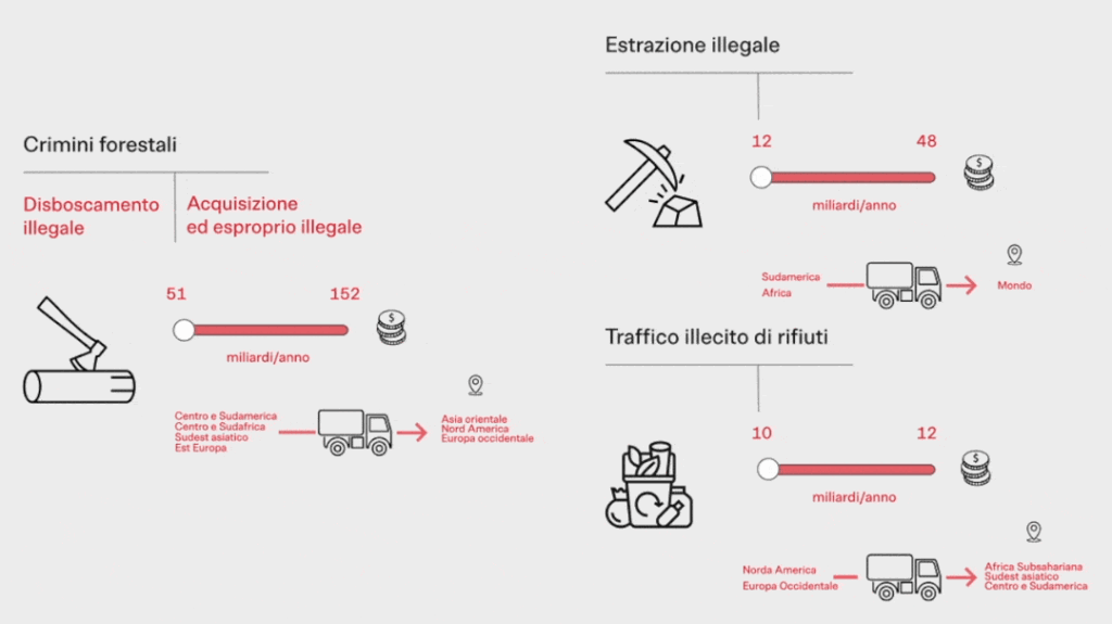 Esistono importanti mercati legali per la gestione dei rifiuti, il disboscamento e l’estrazione mineraria, compresi i metalli preziosi e le pietre. Queste attività spesso diventano illegali quando: (i) vengono intraprese senza autorizzazione statale, (ii) quando i contratti e le concessioni sono assicurati attraverso la corruzione o l’intimidazione, (iii) quando i servizi comportano frodi (ad es., falso trattamento di rifiuti pericolosi), (iv) per la registrazione/estrazione, quando l’estrazione contravviene ai termini concordati, come quote o altri requisiti. Tali attività illegali possono avere impatti significativi sulla salute e sulla sostenibilità delle popolazioni e degli ecosistemi locali. Spesso i criminali si affidano al mercato legale dei beni ambientali per riciclare prodotti e profitti acquisiti illegalmente. Ciò può accadere anche nella misura in cui i prodotti illegali superano quelli del settore legale, come l’oro e il legname.
