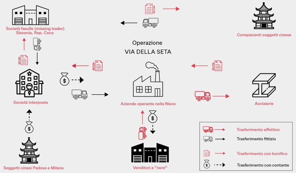 Lo schema si compone di due contesti: nel primo, un gruppo di italiani del Nordest ha dato vita a un traffico di scarti metallici (rame, ottone, alluminio) per circa 150.000 tonnellate aggirando gli obblighi ambientali e di tracciatura vigenti. L’acquisto di questi scarti avveniva in nero, ma per venderlo alle acciaierie c’era bisogno di emettere fatture. Mentre in una seconda fase i cittadini cinesi residenti in Italia avevano il compito di far arrivare le somme accumulate in Cina e metterle al riparo dal fisco italiano.