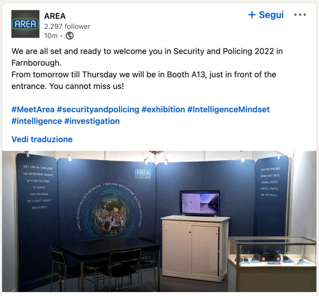 Among the sponsors of Iss World Europe 2023 are also three important Italian companies: RCS, IPS and Area, all involved in controversies with interesting outcomes. The former had developed Hermit, a spyware used in Italy and Kazakhstan, a country with a long history of spying on political opponents. IPS and Area were featured in the 2017 documentary Spy Merchants, produced by Al Jazeera, which showed, thanks to an undercover collaborator, how companies offered their clients the chance to circumvent export controls thanks to subsidiaries abroad.