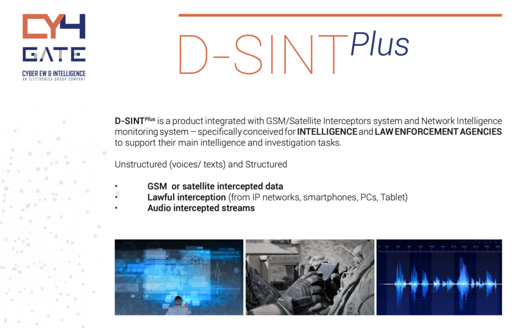 In addition, some old brochures dating back to 2016 – according to the analyses carried out by IrpiMedia – offer detailed descriptions of these types of data: there is data from GSM and satellite communications, data related to the interception of law enforcement and intelligence activities on devices, and audio streams that are converted into text. These additional features are, in some cases, associated with a product called D-SINT Plus.