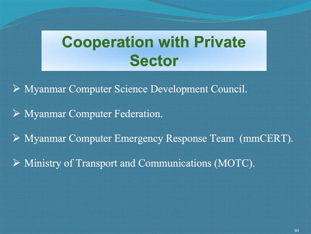 Secondo una presentazione rinvenuta online da IrpiMedia che si è svolta a giugno 2017, all’interno della Conferenza Regionale sul Cybercrime 2017 organizzata dal Dipartimento di Giustizia delle Filippine in collaborazione con l’organizzazione internazionale Consiglio d’Europa nell’ambito di un progetto congiunto con l’Unione Europea, il MOTC collabora con la polizia e il Ministero degli Interni birmano. La presentazione, che riporta il nome di una ufficiale del Dipartimento per il crimine organizzato transnazionale e risalente al 2017, delinea la situazione del crimine informatico in Myanmar, sottolineando le sfide e le soluzioni messe in atto dalla polizia. In una slide dove si sottolineano i partner che aiutano nelle indagini, è indicato anche il Ministero dei Trasporti e delle Comunicazioni.
