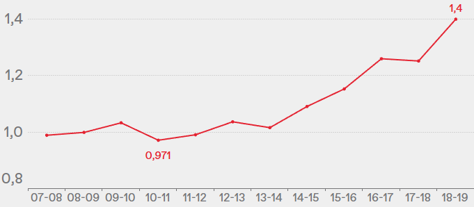 I ricavi per la vendita dei diritti televisivi e radiofonici della Figc dalla stagione 2007-2008 alla 2018-2019 [€/miliardi]