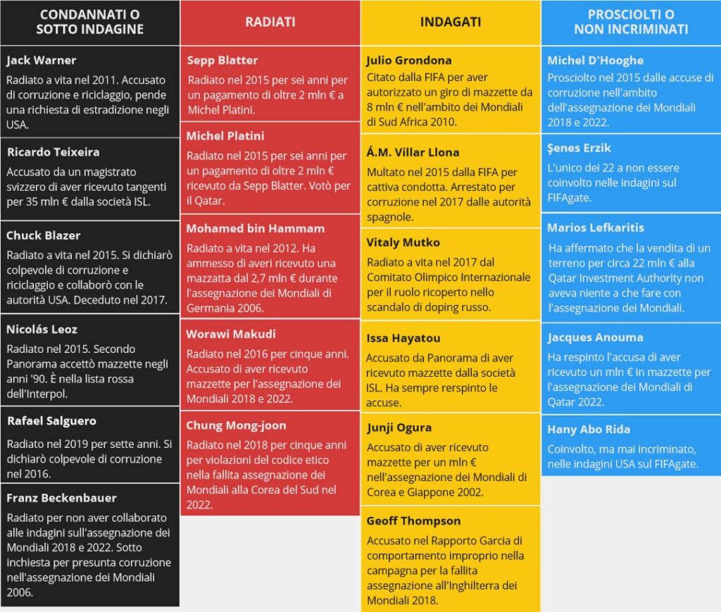 Un’analisi di Sport Intelligence elaborata da ilfattoquotidiano.it mostra che soltanto due membri del Comitato Fifa sui ventidue che presero parte al voto uscirono indenni da quelle indagini. Da Jack Warner a Chuck Blazer, da Franz Beckenbauer a Michel Platini fino a Sepp Blatter, tutti o quasi sono stati quantomeno coinvolti nelle indagini. Tre di loro si sono dichiarati colpevoli di appropriazione indebita o corruzione, più della metà sono stati radiati dal calcio e quasi la totalità sono stati accusati o indagati per pratiche illeciti o per violazioni del codice etico.
