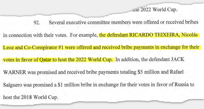 Per vedere la vicenda citata all’interno di documenti di tribunale bisogna aspettare il 2020. In uno dei filoni del Fifagate, la procura del distretto Est di New York nominava Ricardo Teixeira, Nicolas Leoz, Rafael Salguero – tutti membri del Comitato esecutivo della Fifa al tempo dei fatti contestati – quali destinatari di mazzette «in relazione ai loro voti» per l’assegnazione dell’evento al Qatar, confermando in parte le inchieste del Sunday Times. È la prima volta che episodi di corruzione intorno alla votazione che ha portato la Coppa del mondo nel piccolo emirato vengono citati in documenti ufficiali dalla rilevanza penale.