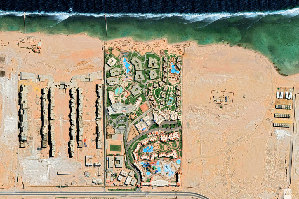 I lavori a Sharm El-Sheikh sembrano non finire mai. La costante costruzione di nuovi resort di lusso per accogliere nuovi turisti ha completamente trasformato le coste, arrivando a impedire ai locali l’accesso libero alle spiagge. Le immagini satellitari mostrano decine di cantieri aperti per nuovi alberghi che risalgono al periodo precedente la pandemia di Covid-19.
