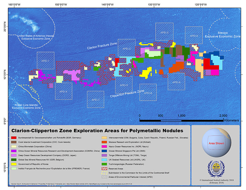 Una mappa della Clarion-Clipperton Zone, situata nell’Oceano Pacifico Centrale. Le zone colorate rappresentano le aree in cui sono state concesse licenze esplorative per l’estrazione di minerali. Le zone barrate sono attualmente protette da attività estrattive © International Seabed Authority