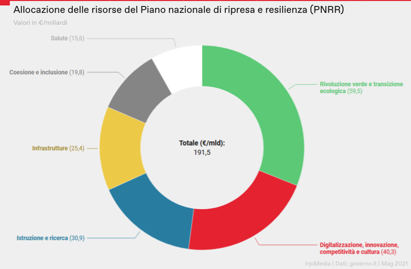 Il piano presentato da Draghi rispetta le linee guida di Bruxelles, perché destina 59,47 miliardi di euro per la «rivoluzione verde» (il 40% delle risorse totali) e 40,32 miliardi di euro per la «rivoluzione digitale» (il 27% del totale). Gli altri miliardi disponibili sono ripartiti in altre quattro “missioni”: mobilità sostenibile (25,40 miliardi), istruzione e ricerca (30,88 miliardi), inclusione e coesione sociale (19,81 miliardi), salute (15,63 miliardi).