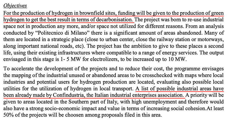 Per il PNRR italiano, l’idrogeno verrà prodotto in siti industriali dismessi già allacciati alla rete del gas esistente e poi trasportato ad altre industrie che lo utilizzeranno – si parla soprattutto di industrie chimiche, petrolchimiche e raffinerie, settori non elettrificabili – tramite blending, cioè in miscela al 2% con il metano. Le pagine in inglese, specificano che una prima lista di questi siti dismessi è stata fornita da Confindustria e che l’idrogeno potrà essere trasportato nei gasdotti, in miscela fino al 10%.
