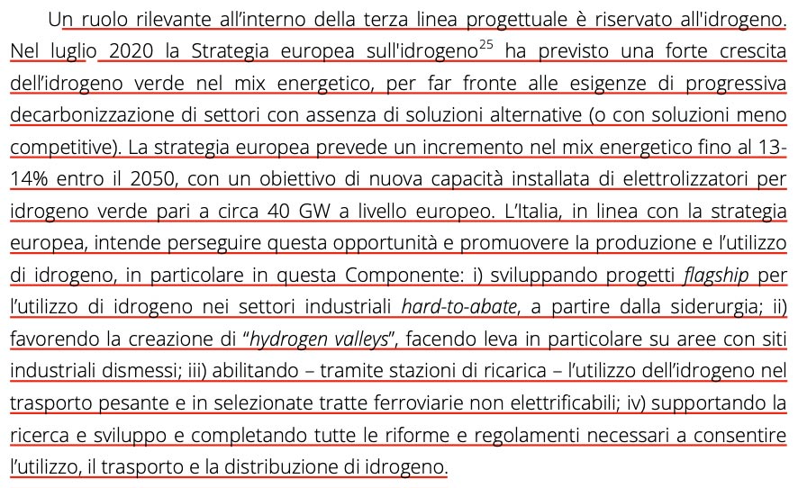 Il documento ufficiale fa riferimento soltanto all’idrogeno verde, specificando che l’Italia investirà sullo sviluppo delle rinnovabili. Gli allegati riprendono l’idrogeno verde come obiettivo finale, includendo però, nella fase di transizione, altri combustibili, incluso l’idrogeno blu, prodotto da gas. Nelle pagine in inglese si legge che, per ridurre le emissioni di Co2, l’Italia pensa di seguire tre strade: ridurre la domanda di energia, in particolare per la mobilità e i consumi privati; modificare il mix energetico a favore di una più ampia disponibilità di rinnovabili, combinate con la produzione di idrogeno; e sfruttare i rifiuti forestali, accompagnandoli con l’uso della CCS-CCU (cattura, stoccaggio, e riutilizzo dell’anidride carbonica). La tecnologia obsoleta e già fallita di CCS, che dalla versione italiana sembra essere uscita, in quella inglese è considerata come strumento di decarbonizzazione.