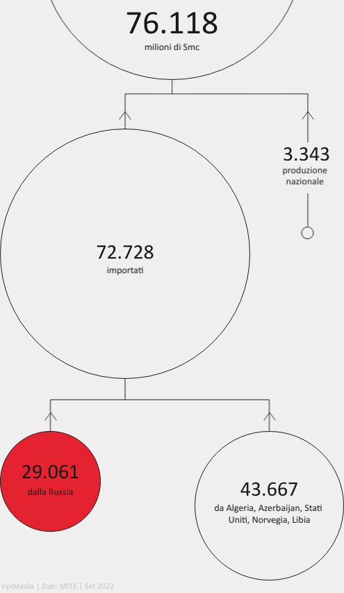 Prima della pandemia, nel 2019, l’Agenzia internazionale dell’energia (Aie), organismo che appartiene all’Ocse, ha calcolato che oltre il 40% dei 6 milioni di terajoule di energia consumati in Italia sono prodotti con il gas. Le fonti che seguono sono petrolio (34,4%) e rinnovabili (complessivamente il 19,4%). Nel 2021, secondo i dati forniti dal Ministero della Transizione ecologica (Mite), il fabbisogno nazionale di gas ha raggiunto i 76.118 milioni di standard metri cubi (Smc).