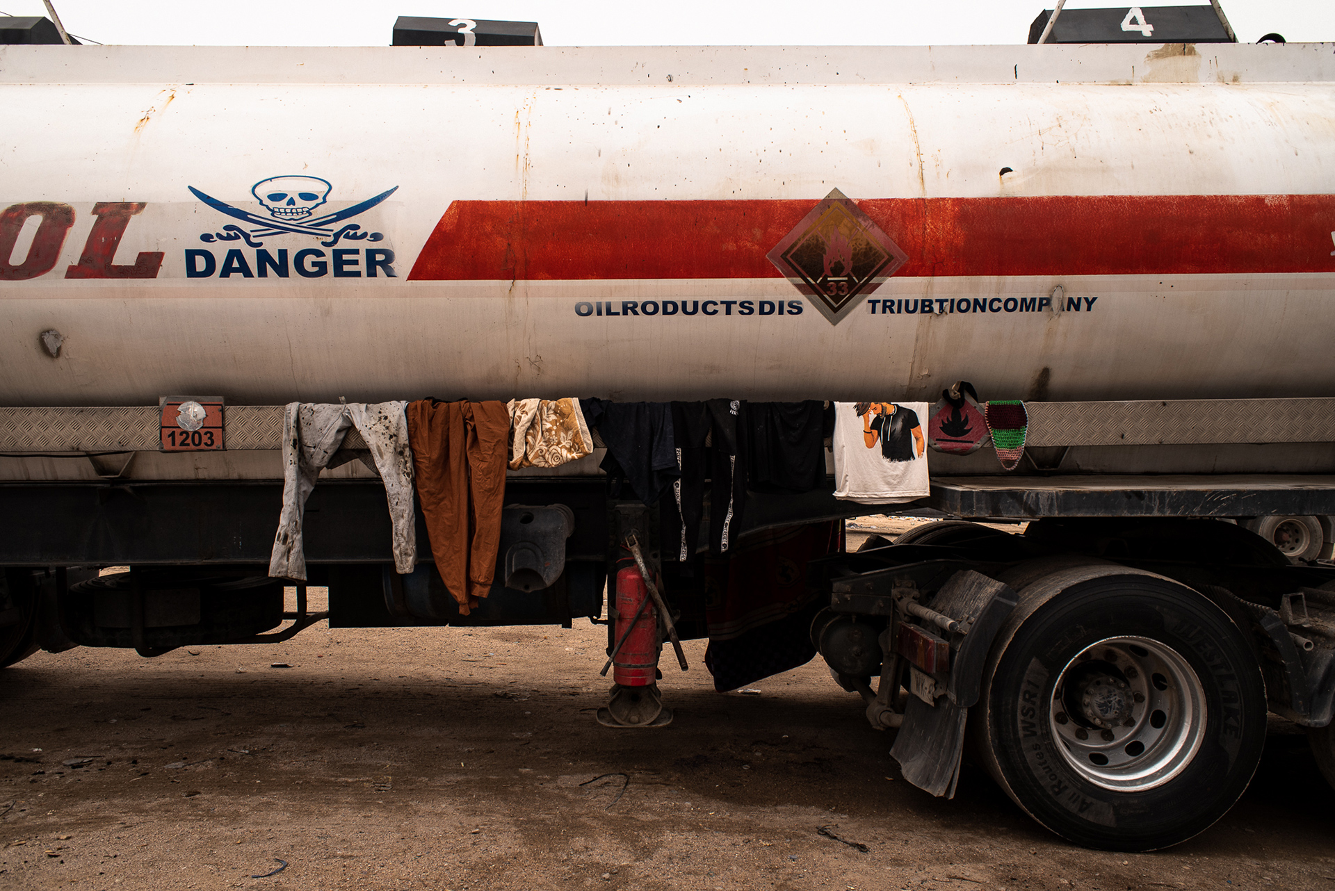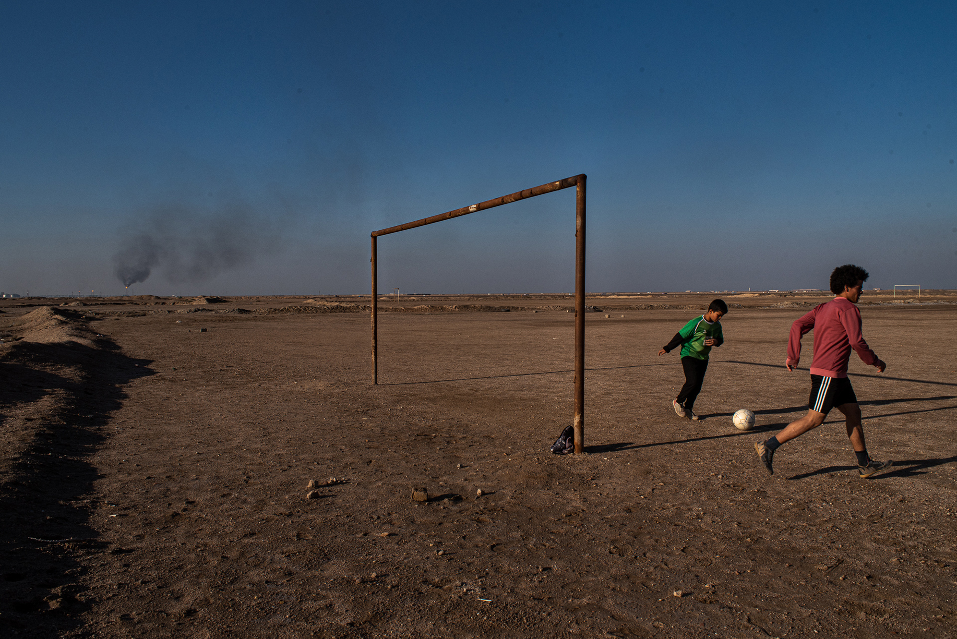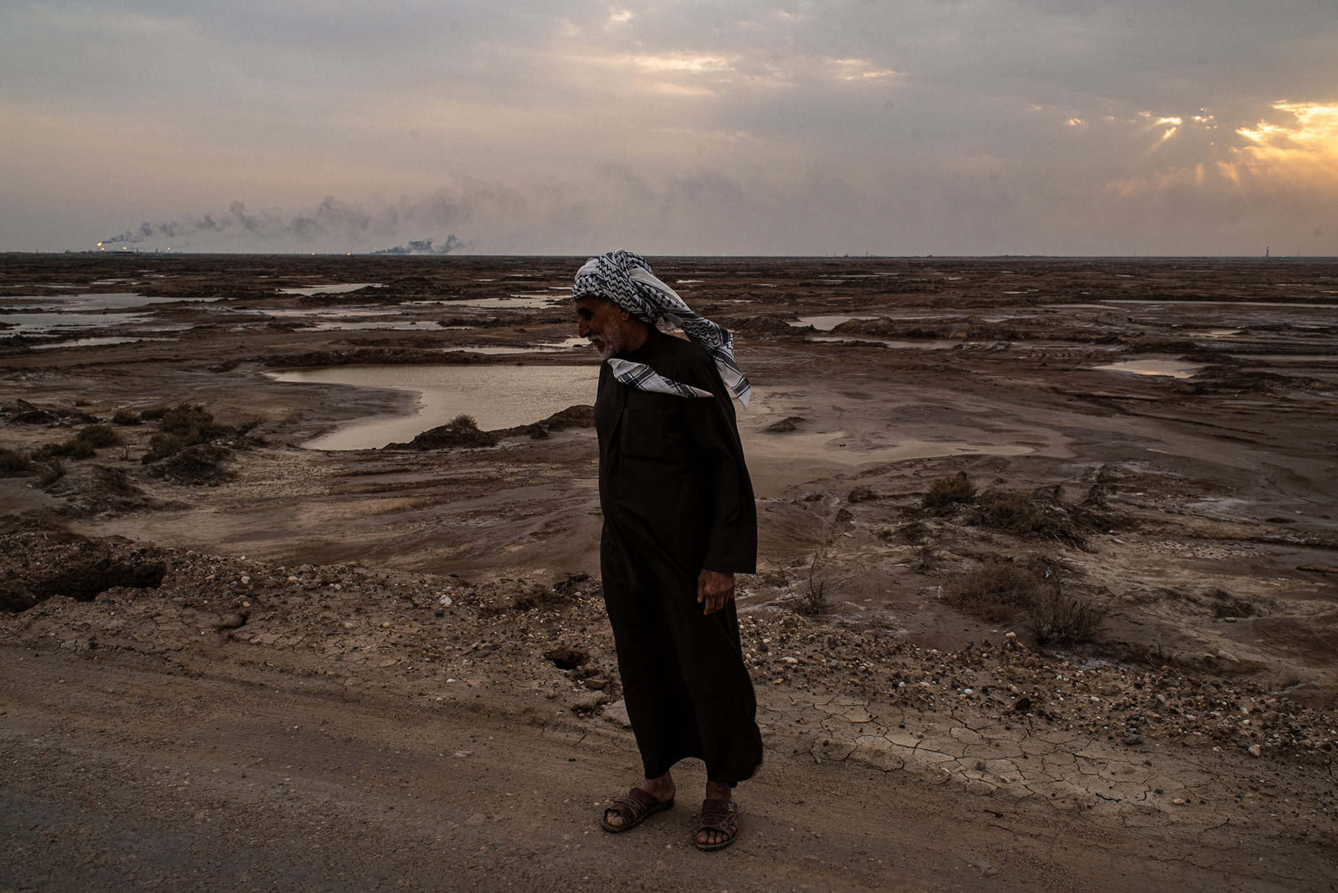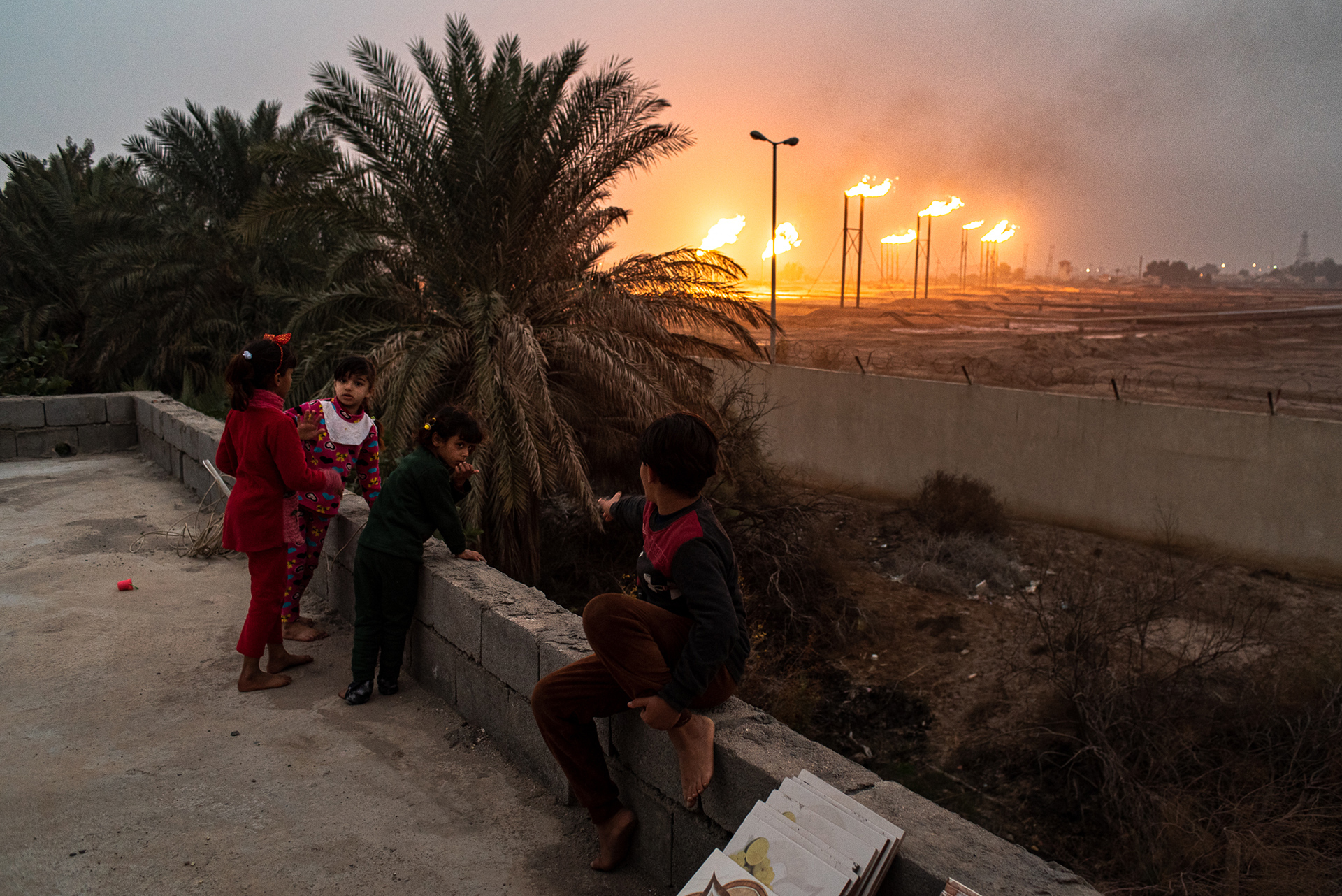 Per Mutir, privato dell’acqua e dell’unica fonte di reddito, il giacimento di Zubair è un vicino ingombrante a tutti gli effetti: nelle giornate di cielo sereno, i pozzi e i loro pennacchi di fumo sono ben visibili dalla casa di Mutir e puntellano tutto l’orizzonte. In auto ci vuole più di mezz’ora per avvicinarsi ai pozzi. L’area prende la forma di un’immensa distesa fatta di terreni brulli, zone densamente abitate, discariche e parcheggi per gli autotrasportatori di petrolio.