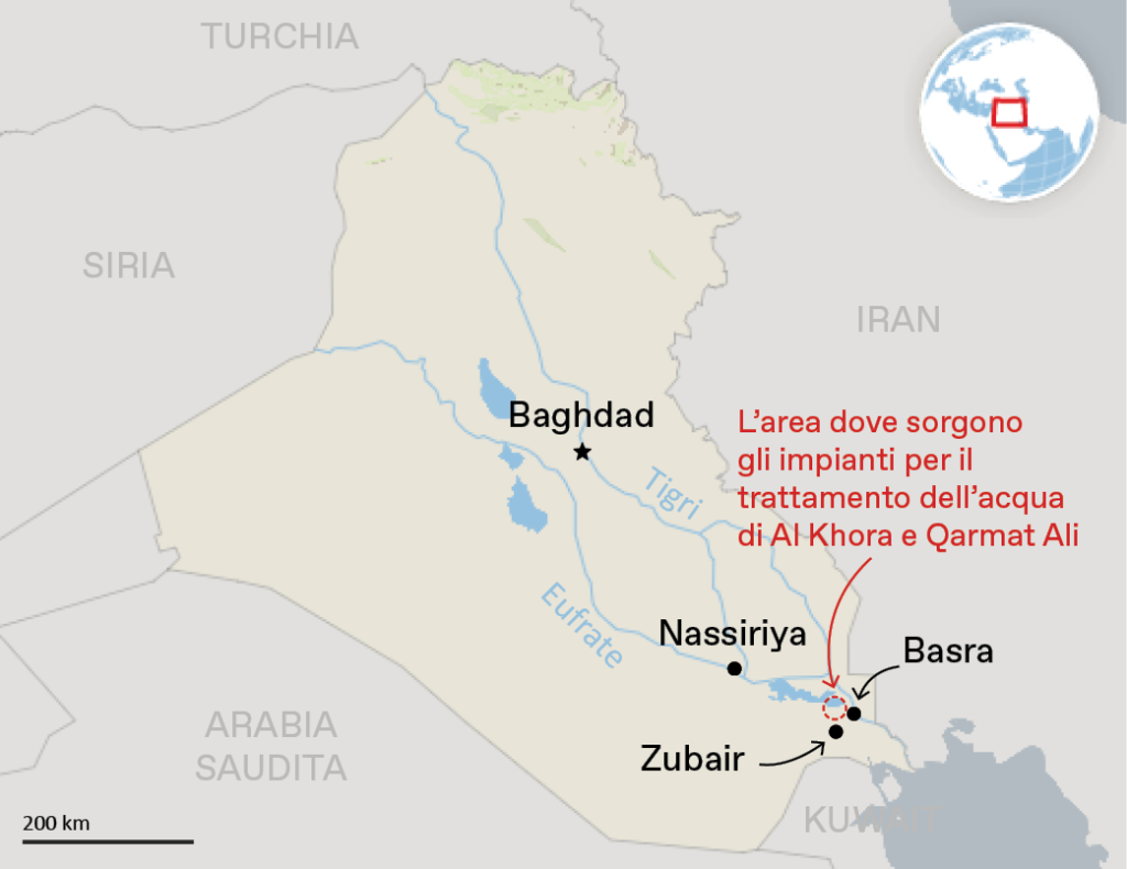 Nel 2022 ha poi annunciato con grande clamore un progetto, in partnership con l’Unione europea e Unicef, in cui annuncia la costruzione di una serie di infrastrutture per la fornitura di acqua potabile ad oltre 850 mila persone. Uno dei progetti supportati da Eni, insieme ad altre compagnie, consiste nella ristrutturazione di un impianto di depurazione dell’acqua sullo Shatt Al Arab. Una volta completato fornirà 19.200 metri cubi di acqua al giorno alla città – per un confronto, a Zubair ogni giorno vengono iniettati nei pozzi poco meno di 25.000 metri cubi di acqua al giorno, prelevata da Qarmat Ali.