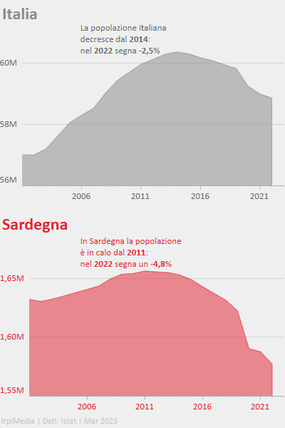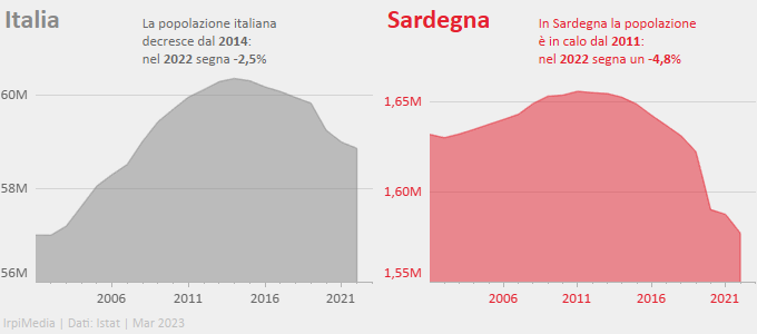 Tra il 2011 e il 2022, si passa da 1,656 milioni a 1,577 milioni di abitanti, oltre 60 mila in meno. In un solo anno, tra il 2019 e il 2020, complice anche la pandemia di Covid-19, il numero di residenti scende di 21 mila unità. L’indice di vecchiaia, che mostra il rapporto tra abitanti nella fascia d’età 0-14 anni e chi ne ha più di 65, è uno dei più alti d’Italia. In più di 300 Comuni supera il 200%, arrivando a toccare il 400% in alcuni centri. E mentre l’età media cresce, la popolazione giovane si riduce. Se nel 2019 la Società Italiana di Pediatria metteva in guardia rispetto alla discesa sotto le 10 mila nascite all’anno in Sardegna, la soglia è oltrepassata già nello stesso anno. A inizio 2023, l’Istat ricorda infine come la Sardegna registri il dato più basso di nuovi nati tra le regioni italiane – 4,9 ogni mille abitanti – ben al di sotto di una media nazionale di 6,7. Nel 2050, titolava a dicembre 2022 il quotidiano La Nuova Sardegna, sarà «l’isola dei pensionati».