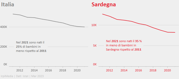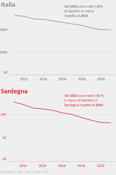 Il calo di natalità in Sardegna è molto più accentuato rispetto alla media nazionale: sull’isola, nel 2021 sono nati 8.232 bambini contro i 12.650 del 2011