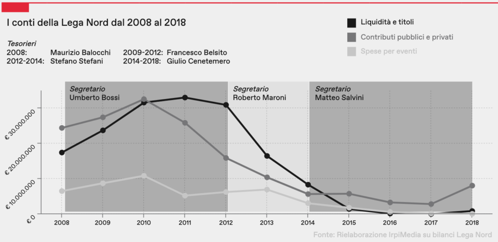 È durante questo interregno che il “tesoretto” dei bilanci del Carroccio sembra evaporare. Nel 2011 i bilanci segnavano 33 milioni di euro di liquidità e titoli a cui si affiancavano circa 26 milioni di contributi dello Stato e di persone fisiche e giuridiche. Il patrimonio attivo toccava quota 47 milioni. Tra il 2012 e il 2014, gli anni di Maroni segretario, la liquidità scende da 31 a 8 milioni di euro. Durante quei tre anni le spese legali aumenteranno da 300 mila a 3,1 milioni di euro, e gli “oneri diversi di gestione”, spese di cui non è possibile ricostruire l’origine, tocca quota 13 milioni.