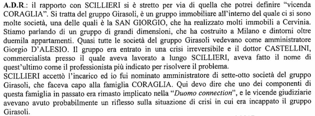 Interrogato, lo stesso Sostegni ricorda davanti ai pm di Milano come sia proprio la “vicenda Coraglia” ad avvicinarlo a Scillieri: «Il gruppo (Girasoli, ndr) era entrato in una crisi irreversibile e il dottor Castellini, commercialista presso il quale aveva lavorato a lungo Scillieri – racconta Sostegni -, aveva fatto il nome di quest’ultimo come il professionista più indicato per risolvere il problema. Scillieri accettò l’incarico ed io fui nominato amministratore di sette-otto società del gruppo Girasoli, che faceva capo alla famiglia Coraglia».