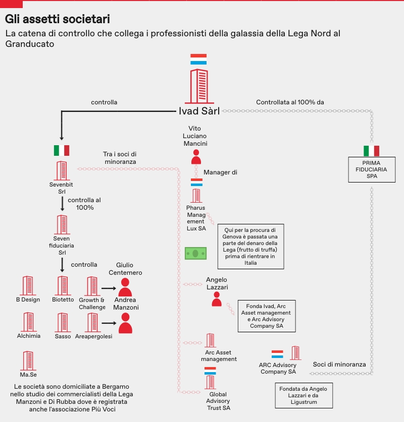Eppure secondo le indagini ancora in corso Lazzari avrebbe un ruolo chiave nell’aver facilitato il presunto riciclaggio della Lega. Tra le sue società infatti, ce ne sono tre di particolare importanza, che gli investigatori di Milano e Genova hanno scandagliato a fondo all’epoca delle indagini. La prima è una società anonima lussemburghese, Ivad Sarl, che funziona come una holding. La seconda è Sevenbit, società di fintech di diritto italiano controllata al 90% da Ivad. La terza è Seven Fiduciaria, controllata a sua volta al 100% da Sevenbit. Seven Fiduciaria in particolare, fa da schermo ai reali proprietari di sette società che gli investigatori sospettano possano aver riciclato parte dei 49 milioni.