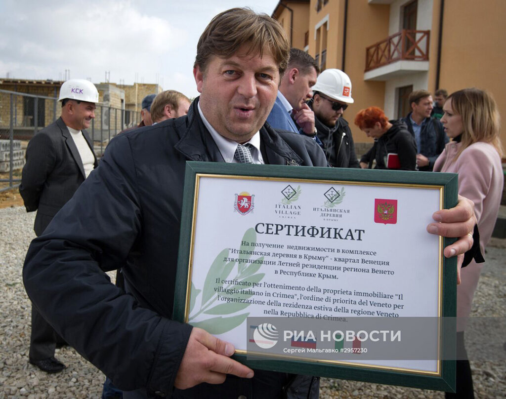 Valdegamberi è stato la guida della delegazione. In una foto del 15 ottobre 2016, lo si vede tenere in mano un certificato in cirillico e in italiano, in piedi in una piazza con dietro degli edifici in mattoncini rossi appena costruiti. Il documento attesta che è diventato proprietario di un appartamento nell’Italian Village, resort esclusivo appena inaugurato – seppur tutt’oggi incompleto – a Chernomorskaya, sulla costa della Crimea. All’evento di inaugurazione ha partecipato anche la Scandiuzzi Steel Construction Spa, società veneta che produce materiali per costruzioni in acciaio. Dalla bozza del programma della tre giorni si legge: «Visita in elicottero sul sito dell’Italian Village per Flavio Scandiuzzi».