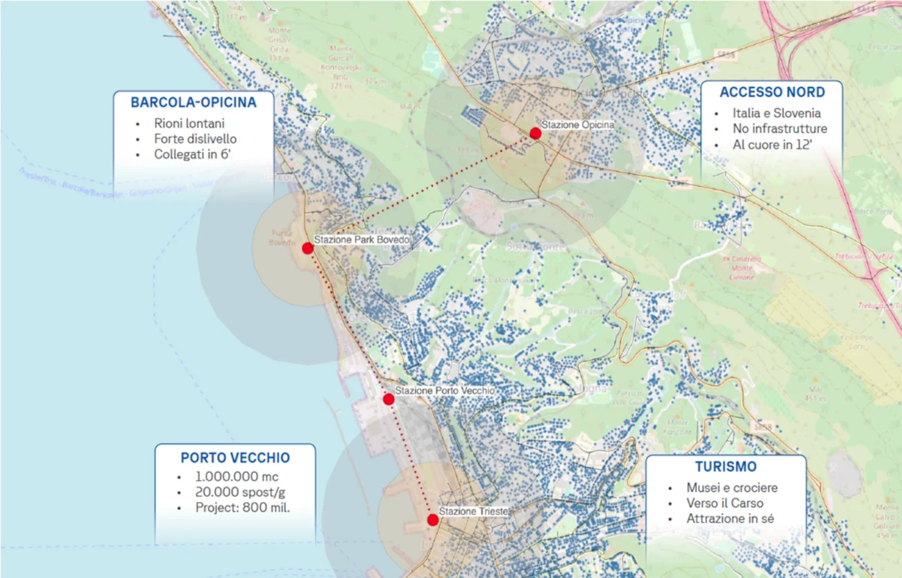 Le stazioni della funivia di Trieste, come da progetto. Il tracciato prevede due tratte e quattro stazioni: la prima collegherebbe Opicina a Bovedo, la seconda tratta andrebbe da Bovedo al centro città, passando per il porto vecchio. Il percorso totale sarebbe di 4,2 chilometri © Comune di Trieste