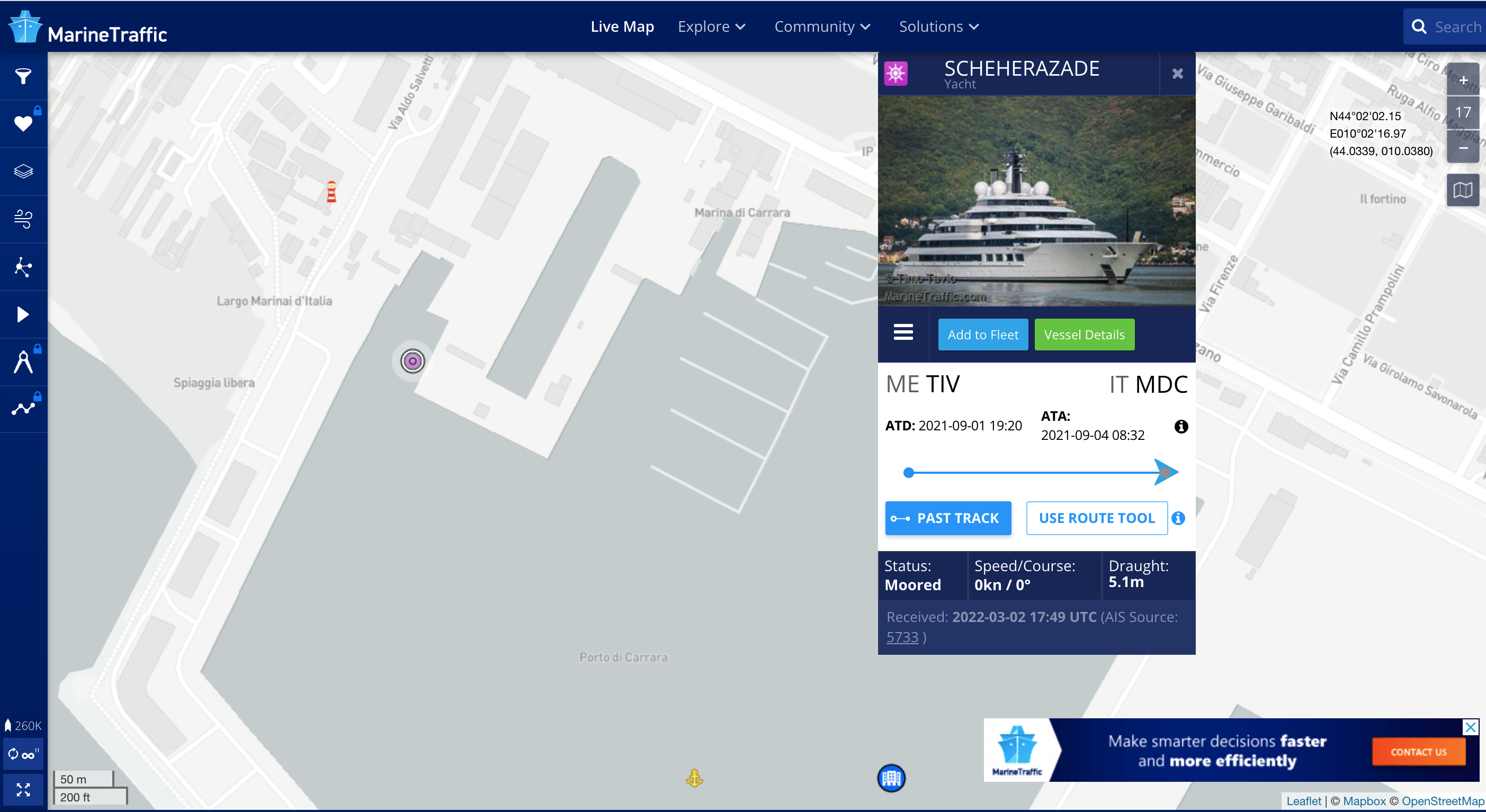 In primo luogo, la Scheherazade, ormeggiata al cantiere Italian Sea Group a Massa Carrara, e congelato con un decreto del Ministro dell’Interno italiano del 6 maggio 2022 in una misura d’emergenza. Sembrava che lo yacht stesse per salpare e lasciare il Mediterraneo, con a bordo il suo equipaggio marziale, che custodisce il più grande dei segreti: chi sia davvero il proprietario.