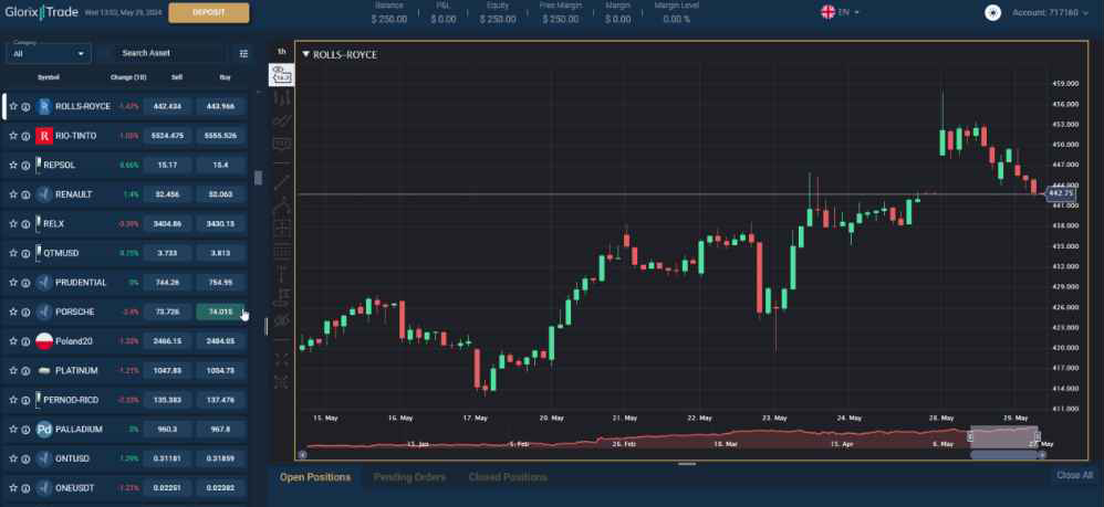 Da un manuale per gli utenti del CRM si vede l’interfaccia che appare al cliente che si è registrato alla piattaforma di investimenti, in questo caso si tratta di GlorixTrade. Una dashboard mostra l’andamento di indici diversi e un tasto in alto invita a depositare il proprio denaro.
