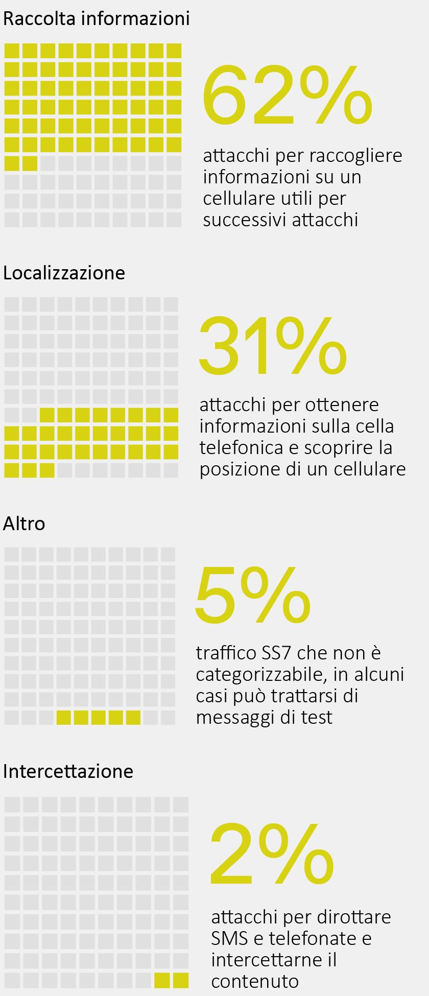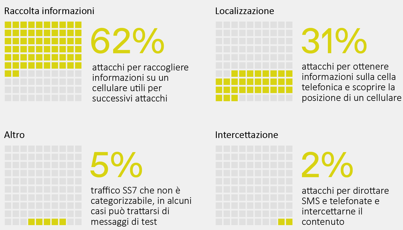 Qualche informazione aggiuntiva la fornisce Enea, società che aiuta gli operatori telefonici a monitorare e difendersi da questi attacchi, la quale nel 2020 stimava che almeno lo 0,04% del traffico su protocollo SS7 fosse considerabile sospetto, anche se non tutto necessariamente malevolo. Di quella porzione infatti la maggior parte sarebbe riconducibile a errori di configurazione da parte degli operatori legittimi mentre l’1,37% risulta effettivamente malevolo. Per il 30% sono attacchi per localizzare un dispositivo e il 2% riguarda l’intercettazione di chiamate e SMS.