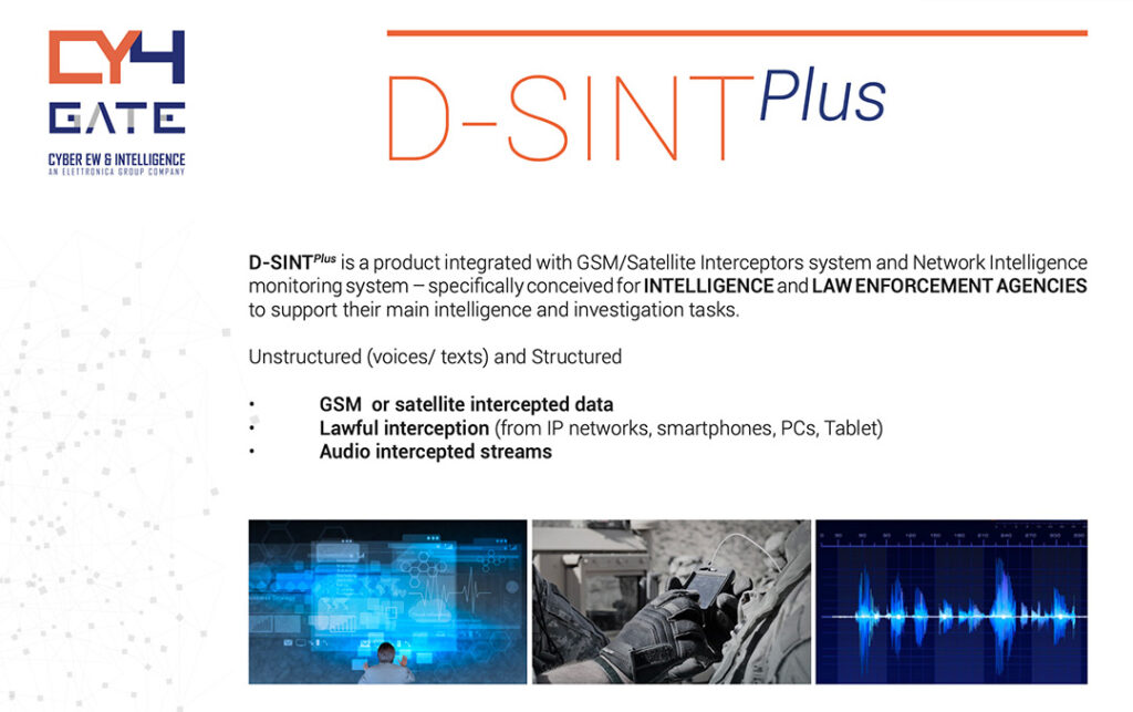 Screenshot tratto da una brochure successiva al 2016 del software sviluppato da Cy4gate: D-SINT Plus. Si tratterebbe di una versione pensata specificamente per le attività di intelligence e delle forze dell’ordine in grado di analizzare i dati delle comunicazioni GSM e satellitari, delle attività di intercettazione e dei flussi di audio