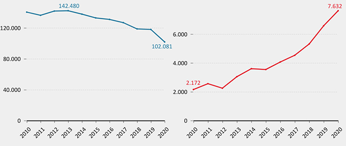 A una decrescita del numero di intercettazioni telefoniche e ambientali corrisponde un aumento di quelle telematiche, secondo i dati raccolti dalla Direzione Generale di Statistica del Ministero di Giustizia