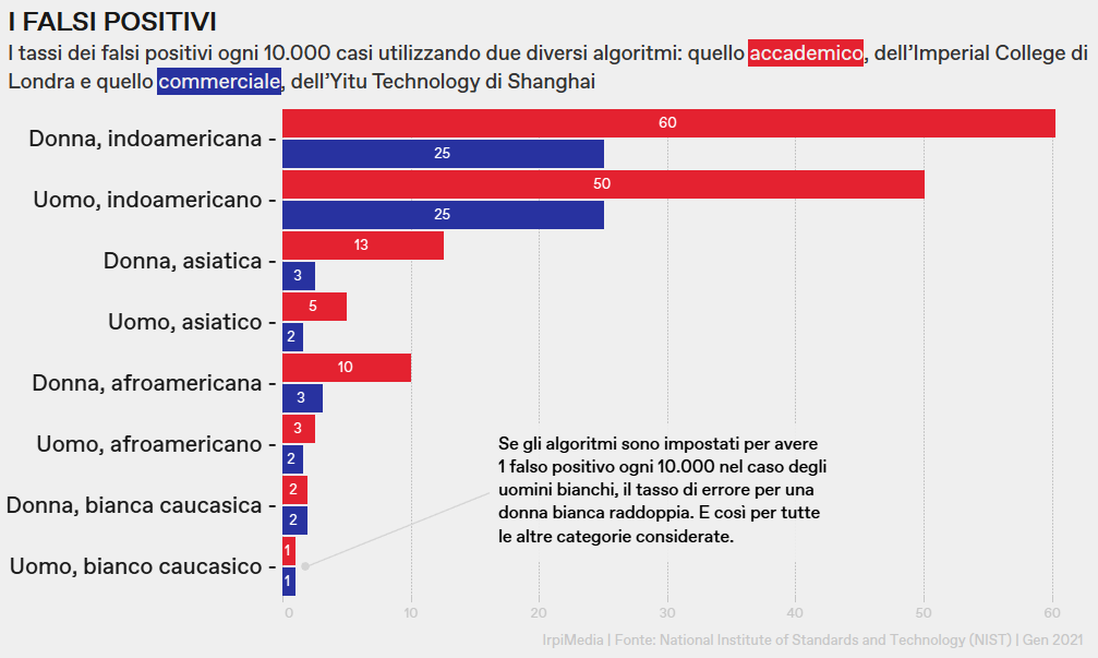 Gli algoritmi hanno difficoltà a riconoscere volti di persone non bianche e rischiano di discriminare anche in base al genere della persona. Nel 2019, un’analisi degli algoritmi effettuata dal National Institute of Standards and Technologies (NIST) ha confermato i risultati dell’anno precedente delle ricercatrici Joy Buolamwini e Timnit Gebru: queste tecnologie tendono a essere più accurate con i volti di uomini bianchi mentre i volti di persone afroamericane o asiatiche hanno una probabilità da 10 a 100 volte più alta di essere identificate in maniera sbagliata. La disparità di trattamento si vede anche nel caso di uomini e donne bianchi. Errori nei software degli algoritmi di riconoscimento facciale hanno già portato all’arresto di due cittadini afroamericani a Detroit in due diversi casi. Il sistema aveva suggerito l’identità di persone che non avevano nulla a che fare con i sospetti ricercati dalla polizia, eppure gli agenti hanno proceduto comunque ad arrestarli.