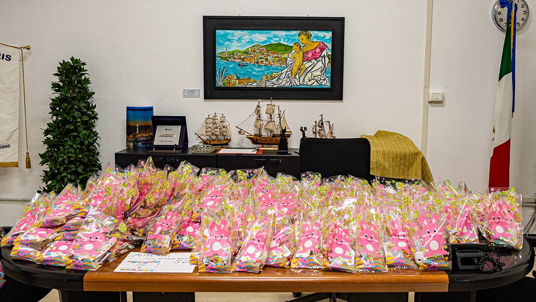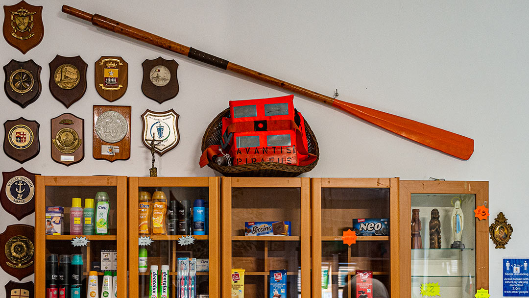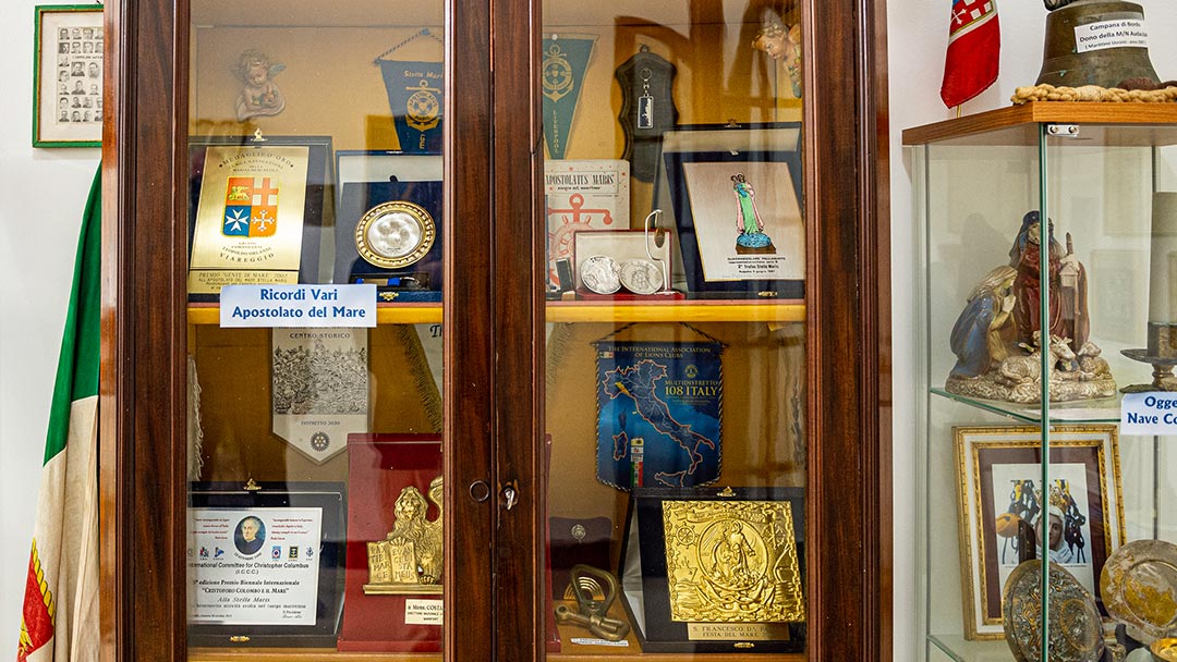I memorabilia più pregiati sono al piano di sopra, sede della parte più spirituale di Stella Maris. Dalla destra, filtra sullo stretto corridoio la luce blu delle vetrate della cappella. Davanti si apre lo stanzone delle riunioni, con al centro un tavolo pieno di conigli rosa. Sono sacchetti dentro i quali i volontari hanno messo dolciumi e caramelle da consegnare a bordo: la Pasqua si sta avvicinando e c’è bisogno di leggerezza. Sulla destra, accanto all’ingresso, un mobile con due ante di vetro raccoglie targhe commemorative e gagliardetti: premi vinti, partecipazioni a eventi internazionali, riconoscimenti. Di poco a lato, una vetrinetta a una colonna contiene Madonne e immagini sacre. Su un piano ci sono anche gli oggetti che vengono dal tabernacolo della Costa Concordia, la nave da crociera naufragata a largo dell’isola del Giglio nel gennaio 2012. In cima, troneggia la campana donata dall’equipaggio della Audacius, una motonave con a bordo un equipaggio tutto di ucraini, aiutato dalla Stella Maris nel 2007. Ora destinata a oggetto puramente ornamentale, quando si trova a bordo la campana rappresenta simbolicamente l’anima di una nave. Donarla equivale ad affidare a qualcuno il suo spirito, in segno di stima e riconoscenza.