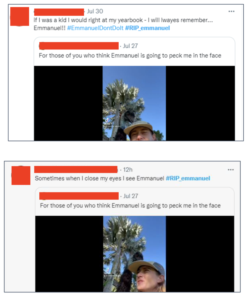 Tra gli strumenti preferiti da Team Jorge c’è la piattaforma AIMS, che sembra essere stata sviluppata in parte internamente circa sei anni fa, il cui acronimo sta per Advanced Impact Media Solutions. Questo software permette di creare e gestire centinaia di finti profili social in tutto e per tutto simili a un qualsiasi account autentico. Per mostrare le capacità di AIMS, su richiesta degli intermediari-giornalisti, Team Jorge ha offerto un esempio attaccando con una campagna sui social un personaggio diventato virale nel 2022 su TikTok e Twitter: un uccello emù chiamato Emmanuel. La campagna di dimostrazione aveva anche un hashtag, ricondiviso dagli avatar di AIMS: #RIP_Emmanuel.