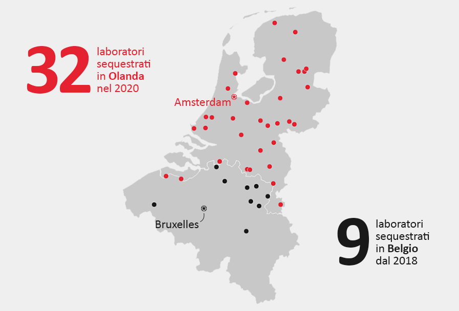 Nel 2020 le autorità hanno sequestrato finora il numero record di 32 laboratori in Olanda. In tutto 19 messicani sono stati arrestati in laboratori di meth tra Olanda e Belgio, secondo i dati del Cartel Project. Il sequestro più recente risale al 30 novembre 2020, quando le autorità olandesi hanno trovato un laboratorio a Westdorpe, sul confine con il Belgio, e arrestato due messicani.