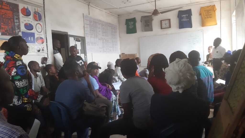 Un momento della riunione presso la sede della Justice & Empowerment Initiative (JEI), un movimento che raccoglie gli sfrattati di oltre dieci anni in Nigeria © Lorenzo Bagnoli