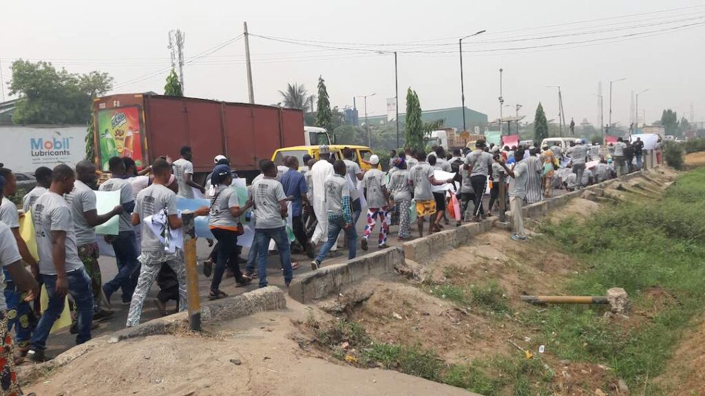 Il 28 gennaio, qualche centinaio di manifestanti sfila da Toll Gate – uno snodo autostradale nella parte settentrionale della città, fino ad Alausa, il quartiere sede dei palazzi governativi. La camminata dura circa un’ora, a bordi delle strade imbottigliate di macchine, come sempre accade nella megalopoli nigeriana. Insieme ai sfrattati, c’è una consistente fetta di persone con disabilità appartenenti a un gruppo che lavora con JEI. Sono venute a esprimere solidarietà. La folla si muove in modo sempre più concitato mano a mano che ci si avvicina alla sede del governo.